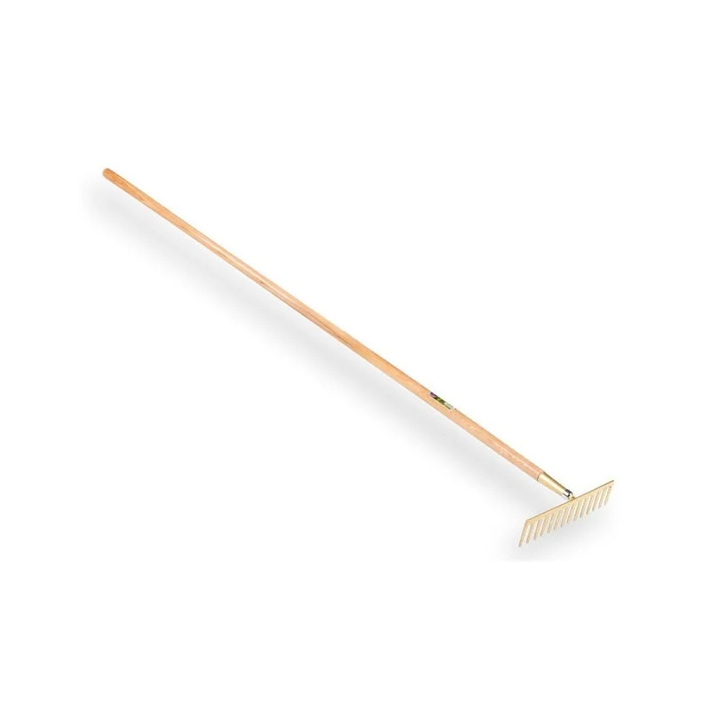 Tuinhark ATLAS met 14 geharde rechte tanden. Meest verkocht model. Gehard stalen hark compleet met gelakte Essen steel 170 x 2,9 cm. Deze hark met rechte tanden is ideaal voor in de tuin, het maken van een zaaibed, het egaliseren/onkruid vrij houden van grindpaden, het fijn maken en egaliseren van grond en wordt veel gebruikt in het infra werk en door hoveniers. De stevige lange gelakte steel voelt prettig aan en is i.c.m. met vloeibaar asfalt goed te reinigen.