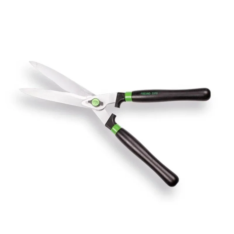 Lichte heggenschaar Freund 5370, lengte 55 cm met aanslagdemper en gegolfde bladsnede. Het gegolfde blad dient voor weerstand en snoeit gemakkelijk houtachtige heggen.
